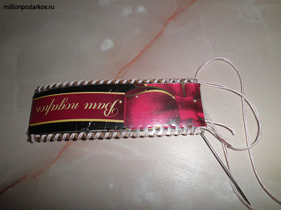 Теперь нужно подготовить два прямоугольника из открыток шириной 2,5 см, а длина зависит от вашего желания. Вложите эти вырезки из открытки между двумя уже прозрачными кусочками пленки и сшейте за один край.