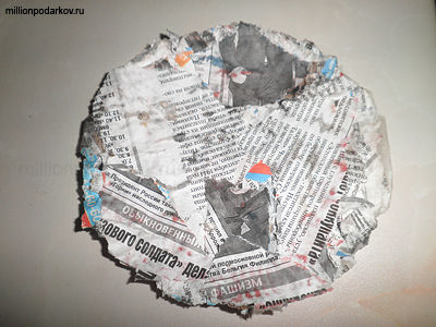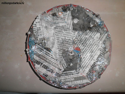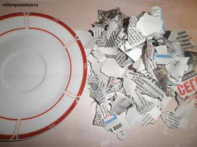 Обмакиваем в клей кусочки газеты и укладываем их аккуратно на тарелочке. Можно сделать из марли для крепости подкладку. Даем время высохнуть.