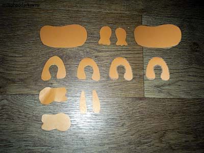 Из картона вырежьте детали поделки. Каждая деталь должна идти в паре. Для начала нарисуйте контуры туловища, головы, шеи, лап и хвоста, а затем вырежьте их.