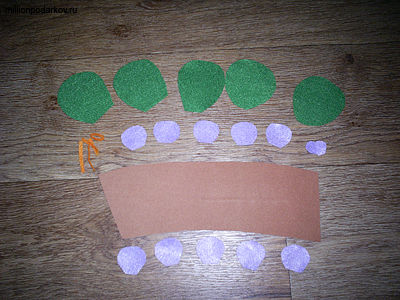 Из зеленого фетра вырезаем листочки. Их потребуется 5-7 штук. Из сиреневого фетра вырезаем лепесточки фиалок – по 4 для каждого цветочка. Из оранжевой фетровой бумаги вырезаем полоски для тычинок. Из коричневой бархатной бумаги вырезаем прямоугольник длиной около 17 см и шириной около 9 см. С двух сторон закругляем его.