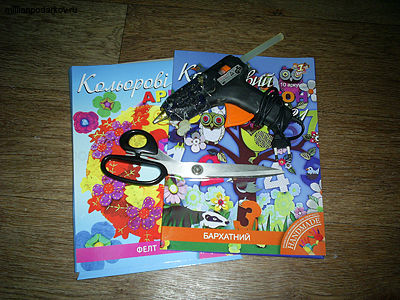 Для того чтобы сделать фиалки, нам пригодились такие материалы, как набор фетровой бумаги и бархатной бумаги, клеящий термопистолет и ножницы.