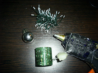 Итак, нам понадобится маленькая пружинка слинки, кусочек искусственной хвои, елочная игрушка, клеящий термопистолет.