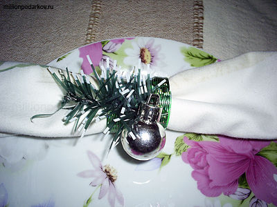 С помощью клеящего термопистолета приклеиваем к пружинке хвою и елочную игрушку. Вот и готово наше замечательное колечко. Осталось поместить в него салфетку. Такие поделки, украшения к Новому году будут замечательно смотреться на праздничном столе.