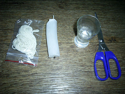 Для того чтобы сделать свечку в рюмке нам пригодились такие материалы, как остатки парафиновой свечки, фитиль, рюмка, ножницы. Также понадобились две кастрюли разных размеров для того, чтобы соорудить водяную баню и прищепка, чтобы держать фитилек, пока парафин не застынет.