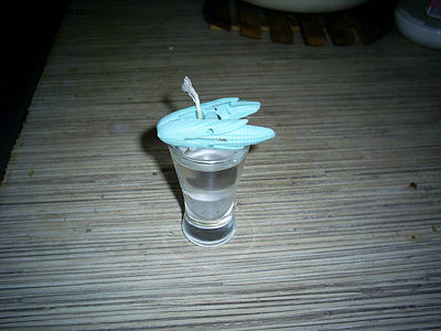 Теперь отрезаем кусочек фитилька и на один его конец крепим кусочек сухого парафина. Кладем фитилек в рюмку. Выливаем в нее жидкий парафин. Обмакиваем им выступающий кончик фитилька и закрепляем в нужном положении с помощью прищепки.