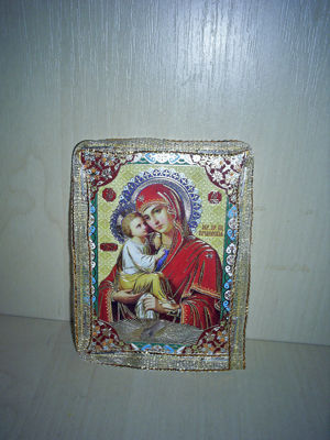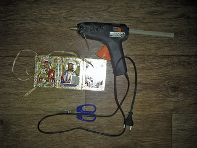 Давайте сделаем небольшую личную икону. Для этого можно воспользоваться вырезкой из журнала или карманным календарем. Также запаситесь ножницами, красивой тесемкой и горячим силиконовым клеем.