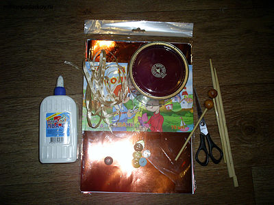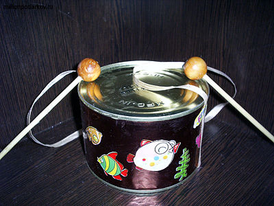 Открываем крышку и вкладываем в банку атласную ленточку. Закрываем плотно крышку. Подбираем палочки. Можно взять для этих целей шампура из бамбука или готовые палочки из другой музыкальной игрушки, например ксилофона.
