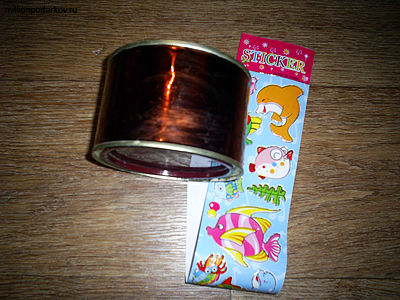 Вырезаем из цветной металлизированной бумаги полоску шириной такой, как наша жестяная банка. Приклеиваем ее клеем ПВА. Выбираем наклейки для декорирования поделки.