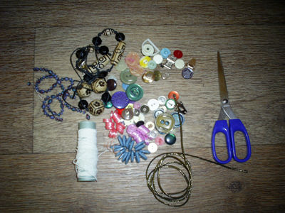 Для изготовления украшений попросите детей принести из дому различные ненужные пуговицы. Также нам понадобится тонкая резинка и ножницы. Пуговицы в украшении можно комбинировать с бисером, бусинками и т.д.