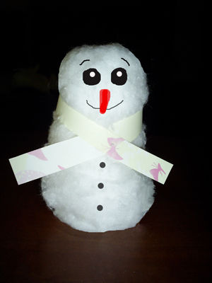 Теперь из цветной бумаги сделайте шарфик, вырежьте глазки, носик морковкой. Нарисуйте фломастерами бровки, ротик. Приклейте пуговички к туловищу снеговика. В итоге у нас получается вот такое забавное чудо. Еще Вы можете из крышечки или бумаги сделать для него шляпку, скатать из синтепона ручки и ножки, добавить метлу из веточек. Дайте волю фантазии, и Вашей поделкой будут любоваться и дети, и воспитатели.