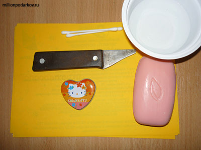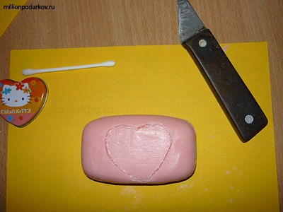 Для поделки нам потребуется нож (лучше с коротким лезвием), кусочек мыла, ватные палочки, вода и форма - сердечко, которое послужит нам трафаретом.