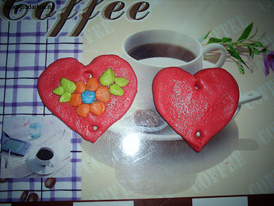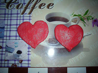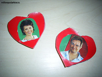 Оставляем изделия сохнуть при комнатной температуре. Вырезаем из картона два сердечка по размеру немного меньшие, нежели наши тестяные изделия и приклеиваем картонки к поделкам. Приклеиваем к одной половинке Вашу фотографию, а ко второй изображение любимого человека.
