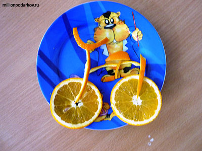 Вырежьте из кожуры апельсина руль, седло и раму. Выложите их на тарелку в нужном порядке и готово! После того, как ваш ребенок скажет, что апельсинки похожи на велосипед скажите ему, что сейчас вкусный велосипед превратится в настоящий, и преподнесите ему свой подарок.