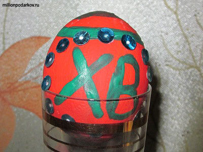 Наносим на яйцо буквы Х.В.. После этого приклеиваем на яйцо пайетки. Поделка яйцо из соленого теста готова!
