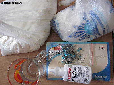 Для того, чтобы у нас получилась поделка яйцо из соленого теста на потребуется мука, соль "экстра", вода, акриловые краски, стаканчик с водой, кость, клей ПВА, пайетки