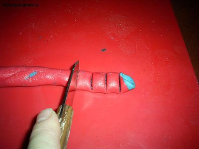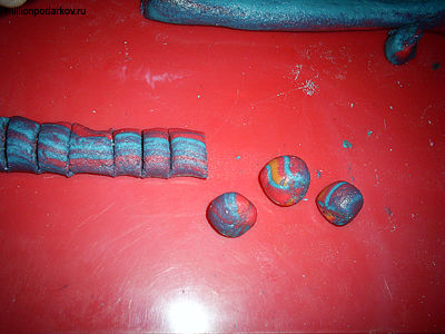 Теперь кладем наши три колбаски на пласт и заворачиваем их в него. Раскатываем руками получившуюся «колбаску» до тех пор, пока он не станет нужного диаметра. Нарезаем ее на бусинки и сплющиваем их или наоборот раскатываем в шарики.