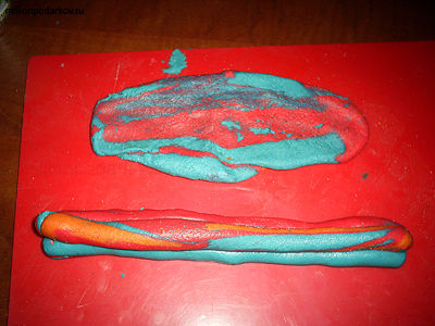 Теперь расскажем о втором способе, как нам сделать замечательные бусинки. Для этого скатаем три разноцветные «колбаски». Также раскатаем прямоугольный пласт теста.