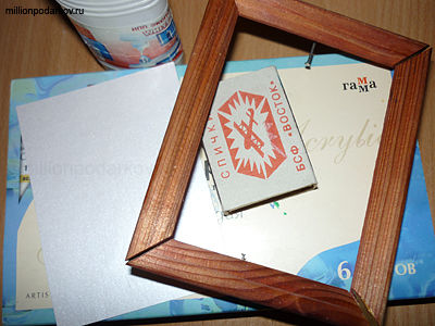 Для поделки декоративно-прикладного творчества о пожаре вам потребуется: картон, рамка, спички, акриловые краски, клей ПВА, кисть, стакан с водой.