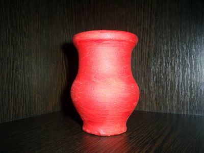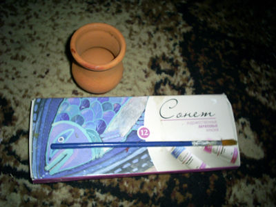 Итак, для изготовления поделки приготовим предмет, который мы будем расписывать. В нашем примере это будет глиняная вазочка. Также подготовим художественные акриловые краски и кисточку из искусственного ворса средней жесткости.