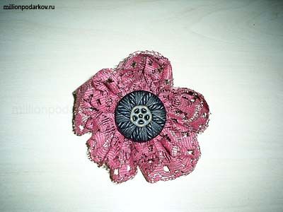 Когда Вы полностью сформируете цветок, пришейте по середине пуговицу. В итоге у Вас получится замечательный цветок, которым можно украсить заколку, подвязку для штор, одежду, открытку.