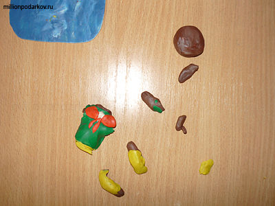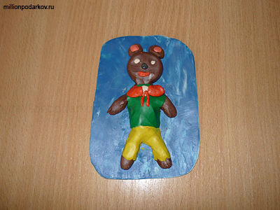 После того, как лист картона покрыт пластилином начните делать персонажа, который будет украшать панно. В нашем случае это мишка. Но вы можете слепить хоть кого, хоть зайца, хоть лису, хоть волка.