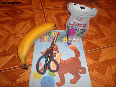 Хвост тоже вырезаем из цветной бумаги и с помощью клея прикрепляем к кожуре банана.