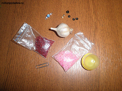 Для изготовления поделки из бисера нам понадобится сам бисер, лучше подобрать разноцветный, головка чеснока, нитки и ножницы. Крупные бусины лучше подбирать контрастные по 2 штуки. Шилом или даже скрепкой можно будет сделать в футляре отверстия, чтобы распространялся запах чеснока. В качестве украшения ожерелья можно выбрать вороний глаз, который спасет ребенка от сглаза, например.