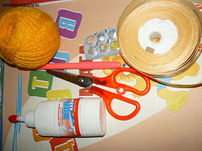 Для изготовления поделки из бумаги для девочек "Осьминожка" нам потребуется: альбомный лист, цветная бумага, клей ПВА, ножницы, кластеры от таблеток, нитки, фломастеры, атласная лента.
