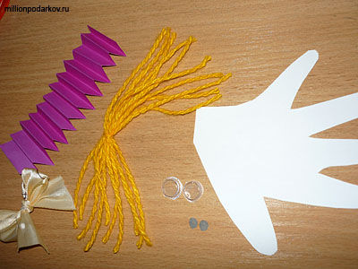Обводим ладошку вашей дочки, затем выстригаем ладошку из бумаги. Из кусочка цветной бумаги делаем гармошку,это будет юбка,подгоняем её по размеру,для нашей осьминожки. Делаем из кластеров от таблеток глазки. Сворачиваем нитки несколько раз, перевязываем по середине,это будут волосы. Из атласной ленты делаем бантик.