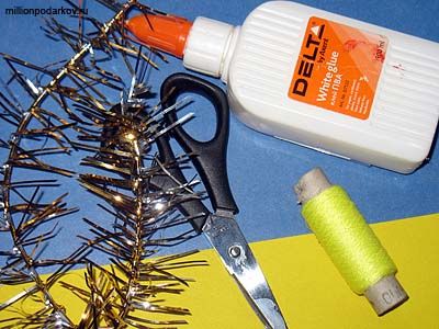 Приготовим для работы такие материалы: синюю и желтую двустороннюю бумагу, ножницы, клей ПВА, катушку ниток, новогоднюю мишуру.