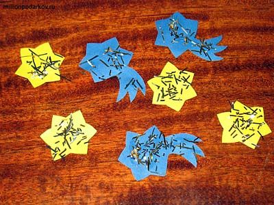 Из желтой бумаги вырезать звездочки, а из синей кометы в нужном количестве. Нарезать мелко новогоднюю мишуру и приклеить к вырезанным деталям.