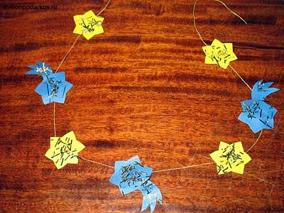 Звездочки и кометы приклеиваем на нитку, с обратной стороны согласно рисунку, приклеиваем звездочки и кометы, чтобы скрыть нитку.