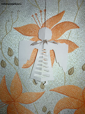 На ёлку можно изготовить поделки из бумаги и ниток. Нитка нужна будет, чтобы подвесить бумажное украшение "Трубящий ангел".