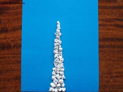Нарезать кусочки белой бумаги и скомкать их в шарики. Из таких шариков выложить и приклеить на картон ствол березы.