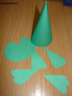 Вырезаем из бумаги зеленого цвета детали нашей будущей лягушки. Склеиваем из зеленой бумаги конус, он будет основой для нашей лягушки.