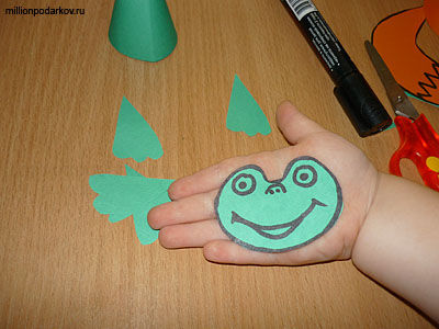 Сегодня займемся изготовлением поделки из бумаги лягушка. Делать это будем вместе с пятилетним ребенком. Так как дети в этом возрасте не особо умеют пользоваться ножницами, детали для лягушки должен вырезать взрослый, а так же помочь нарисовать мордочку и склеить конус.