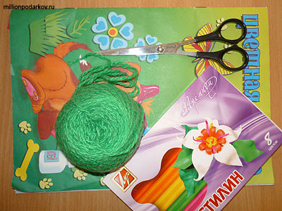 Для поделки из бумаги, ниток и пластилина "Русалка" вам потребуется: цветная бумага, зеленые нитки для вязания и ножницы.