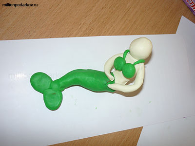 Лепим из пластилина русалку. Хвост и верхнюю бюстгальтер сделаем из зеленого пластилина, а сама русалка будет из белого.