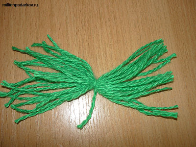 Берем зеленые нитки складываем их несколько раз, затем перевязываем посередине, и у нас получатся отличные волосы.