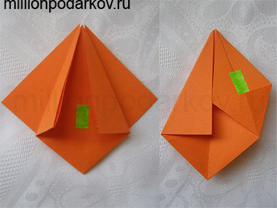 Загибаем углы к средней линии с одной и с другой стороны. После этого, раскрываем углы, как показано на фото