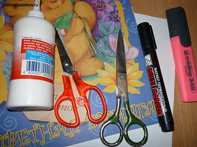для поделки из бумаги ромашка приготовьте цветную и белую бумагу, клей, ножницы и фломастер.