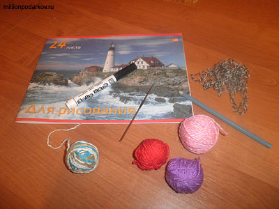 Для изготовления поделки из бумаги рукоделие понадобится пряжа различных цветов, крючок и ножницы. Приготовим бумагу, черный маркер, карандаш и клей, а для добавления красок в работу понадобятся и цветные карандаши.