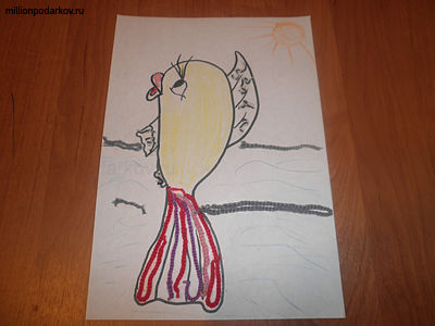 Цветными карандашами делаем рыбку золотой, выбирая желтый цвет, а синим дорисовываем волны. Хотите солнечный день? Всегда пожалуйста!