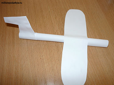 Вырезаем из бумаги полоску шириной 5см длинной 10-12 см. эту полоску скручиваем в рулончик и склеиваем клеем ПВА. Затем вырезаем крылья и хвост для самолета.