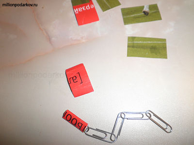 Выбранную расцветку картона нужно порезать на одинаковые прямоугольники так, чтобы они смогли закрыть скрепки почти полностью. С помощью нескольких сложений нужно обернуть каждую скрепку таким картонным прямоугольником.