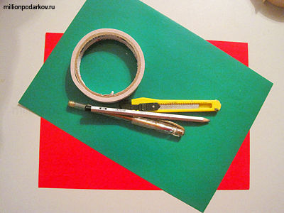 В поделках с симметричным вырезанием имеют значение цвет цветной бумаги, цвет ее обратной стороны и цвет подложки. Мы делаем новогоднюю открытку, поэтому используем традиционные для этого праздника цвета - красный и зеленый. Обратная сторона зеленой бумаги - ярко-белая.
