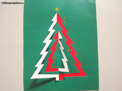 Отгибаем вырезанные половинки. С помощью двустороннего скотча крепим красную подложку. Елочку можно украсить с помощью аппликации.