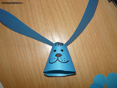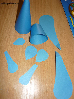 Вырезаем из бумаги голубого цвета детали для нашей поделки ушки, лапки, 2 полукруга, для конусов. Склеиваем конус и небольшой усеченный конус. Усеченный конус будет головой, а длинный конус станет основой нашего зайчика.