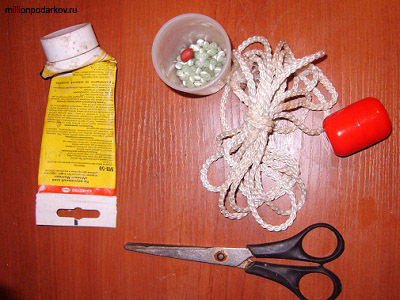 Для поделки из киндеров нам нужна будет половинка киндера. Это должна быть меньшая его половинка. Также нам понадобятся веревка, ножницы, игла (или шило) и бусинки.