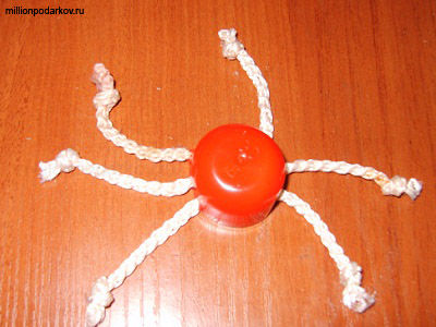 Далее нужно начать делать паука. Начнем с ножек. Для этого сделаем шилом или иглой в киндере дырки. Через них продеваем веревки, на концах которых завязываем узелки. Это и будут ножки паучка.